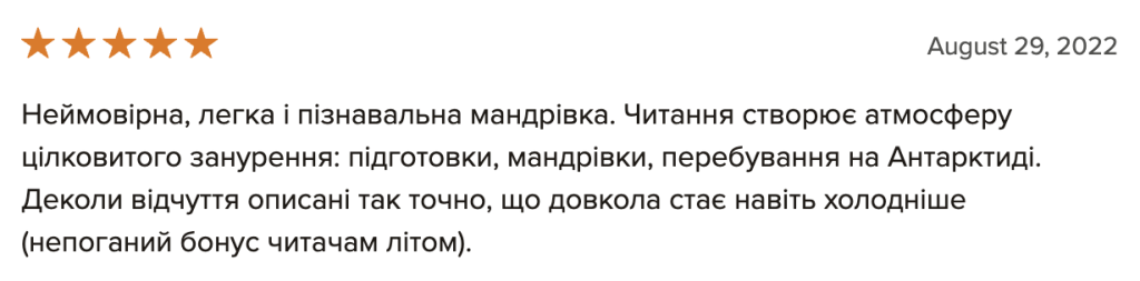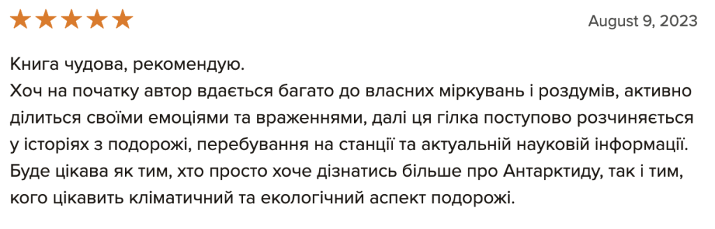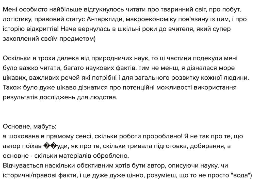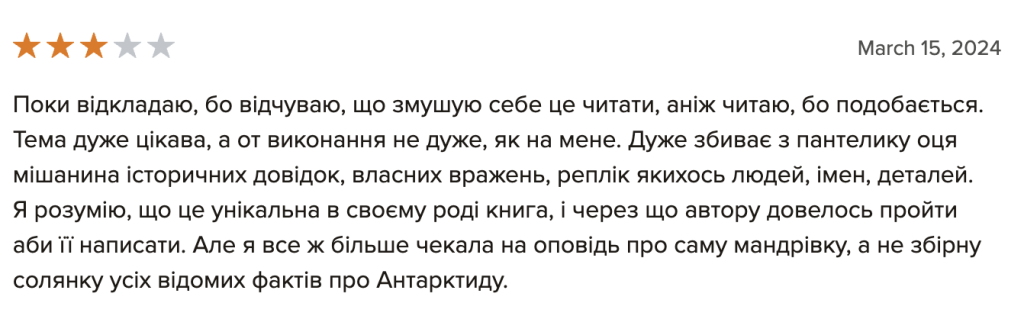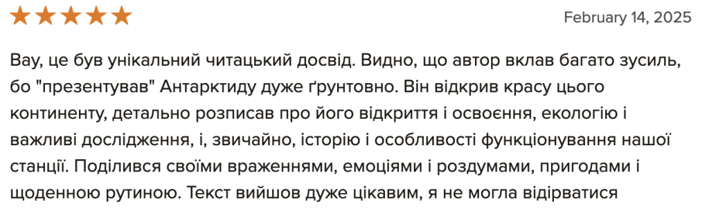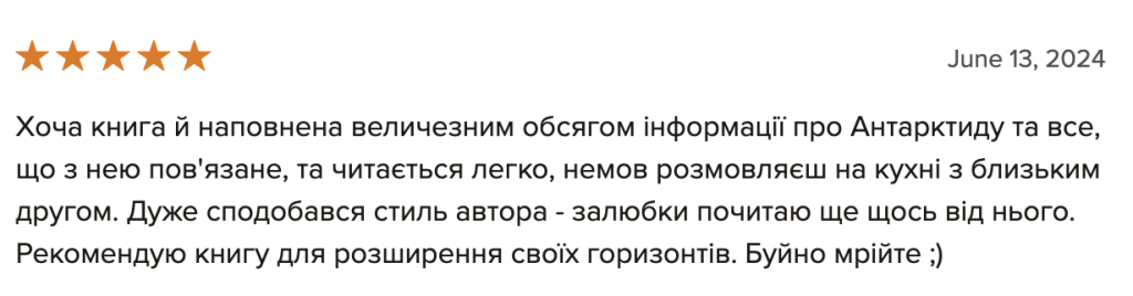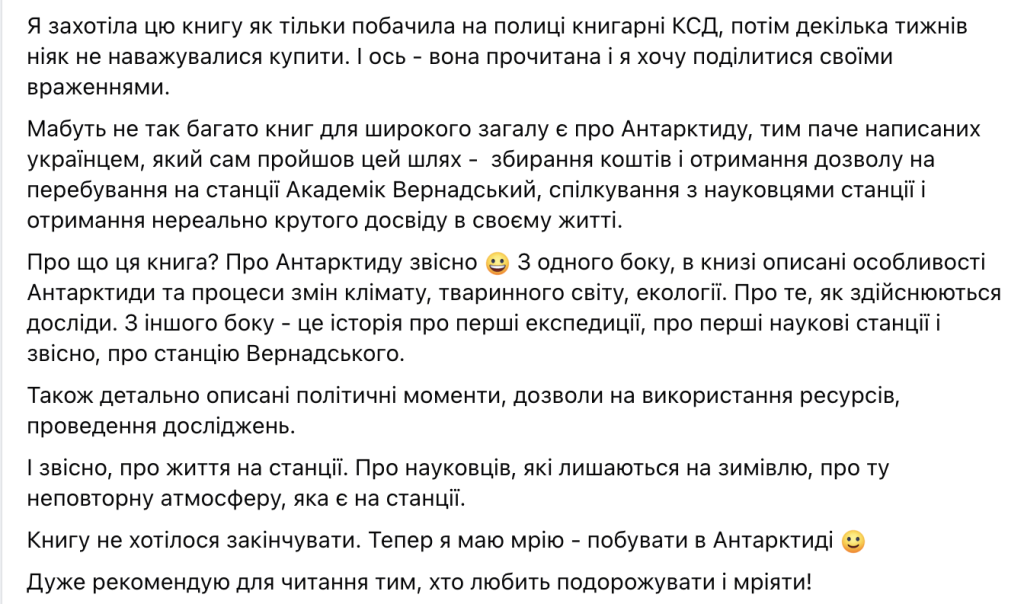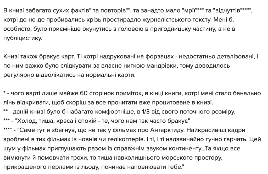“Мрію про Антарктиду”, вже остаточну верстку перед друком, я читав лише один раз, і це зайняло мені цілий тиждень. Книга містить дуже багато фактів і вражень, тож абсолютно не дивно, що є повтори і неоковирності. Втім, думаю, основне зауваження не до того, що погано редаговано, а до того, що людині мій просто не підійти стиль сплетення особистих вражень і фактів у один наратив. Адже: