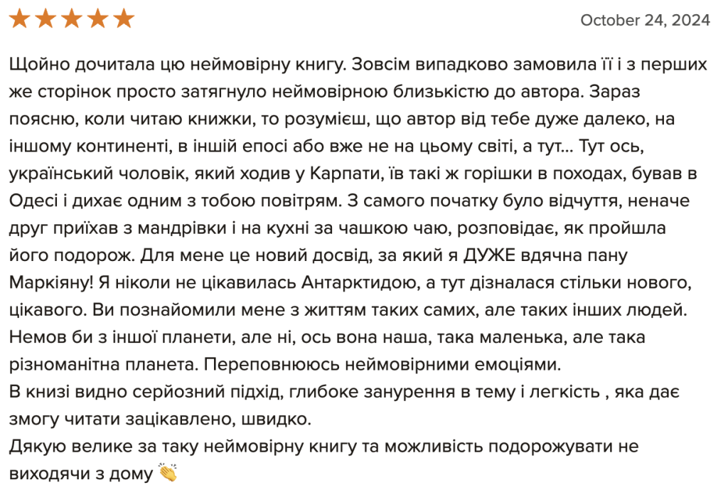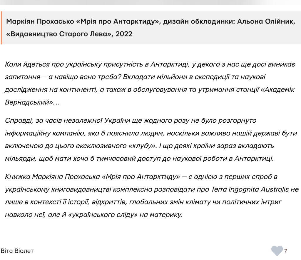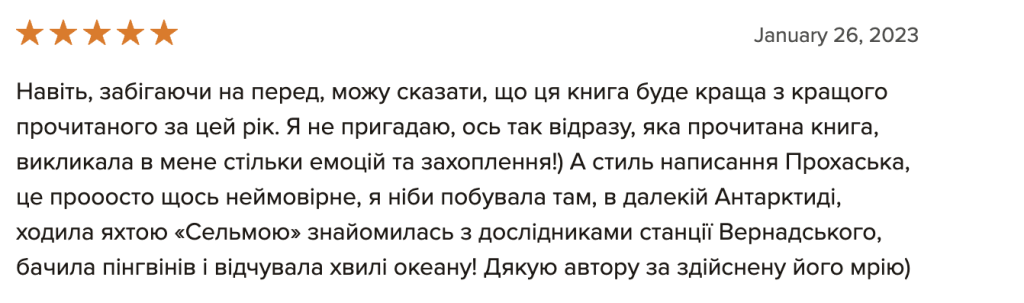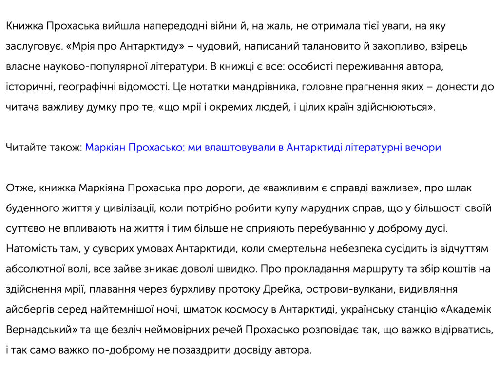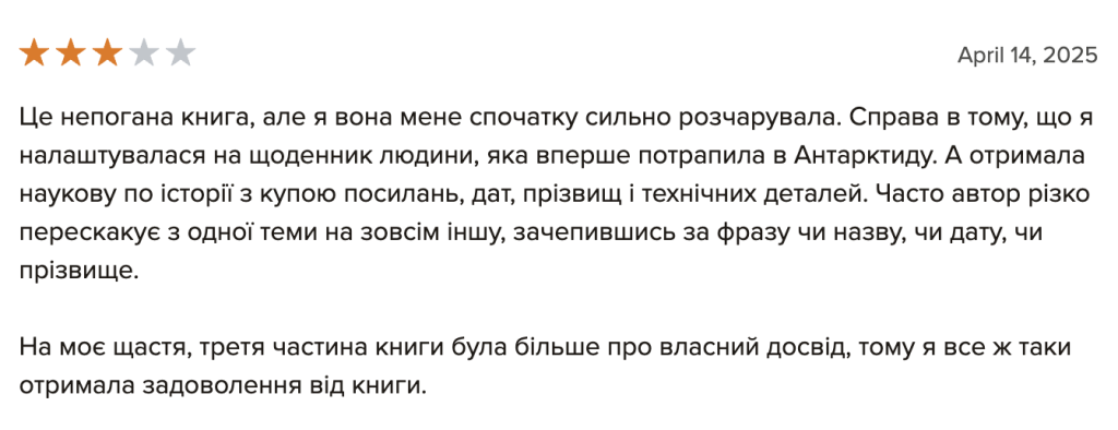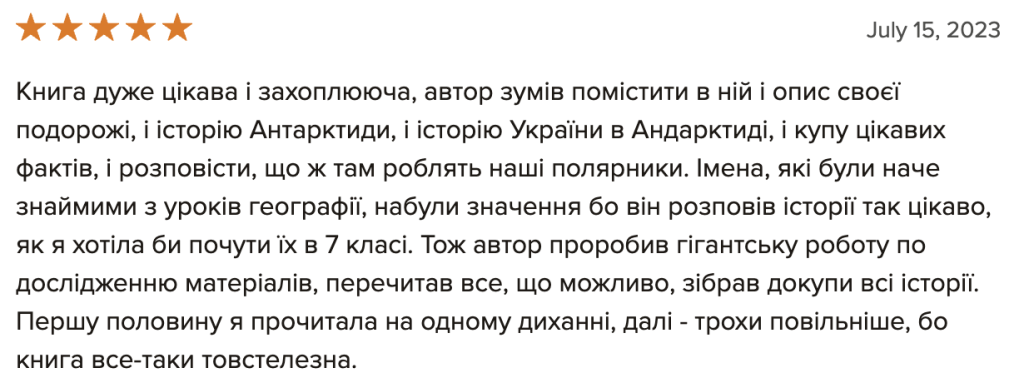“Мрію про Антарктиду”, вже остаточну верстку перед друком, я читав лише один раз, і це зайняло мені цілий тиждень. Книга містить дуже багато фактів і вражень, тож абсолютно не дивно, що є повтори і неоковирності. Втім, думаю, основне зауваження не до того, що погано редаговано, а до того, що людині мій просто не підійти стиль сплетення особистих вражень і фактів у один наратив. Адже: