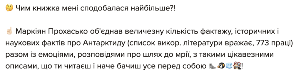 У той же час є ті, кому найбільше сподобалися саме факти про логістику, правовий статус, побут, тваринний світ, історію відкриттів тощо.